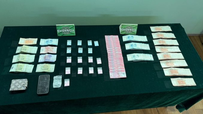 La denuncia motivó un urgente operativo de Carabineros de la SIP, que lograron ubicar al presunto autor de la estafa en las inmediaciones del lugar en que abordó a la víctima, realizando un control de identidad preventivo, y una revisión superficial de sus vestimentas, encontrando la suma de $1.895.000 pesos en billetes falsificados de distinta denominación; además de 17 gramos de Droga del tipo ketamina, y $67.000 en dinero efectivo.