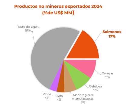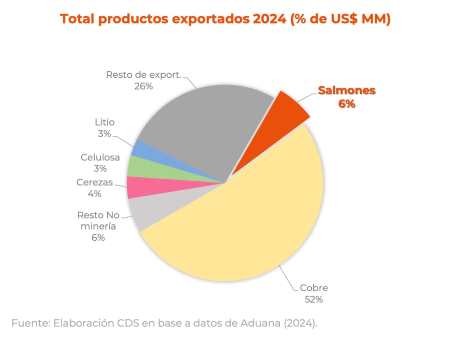 Según la información recopilada por el Servicio Nacional de Aduanas, durante el último año, el salmón representó el 6% del valor total de exportaciones del país, ubicándose como el segundo producto más exportado después del cobre. Respecto a los productos no mineros, el salmón es líder, representando el 17% de las divisas.